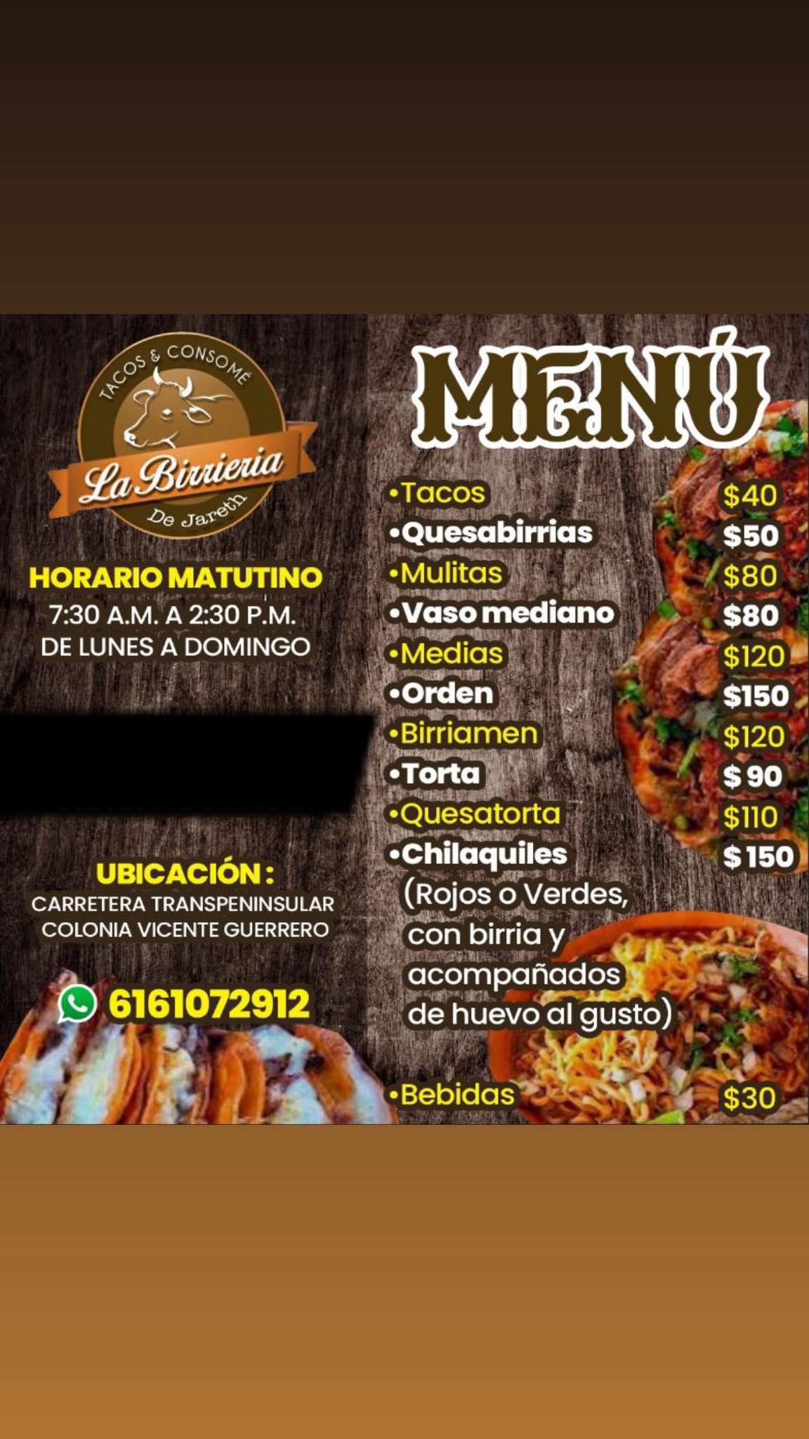 Venta de Tacos, mulitas, tortas, ramen y Chilaquiles rojos o verdes acompañados con un huevo estrellado y Birria de Res. Aguas frescas de Sabor y refrescos. Servicio a domicilio y eventos.